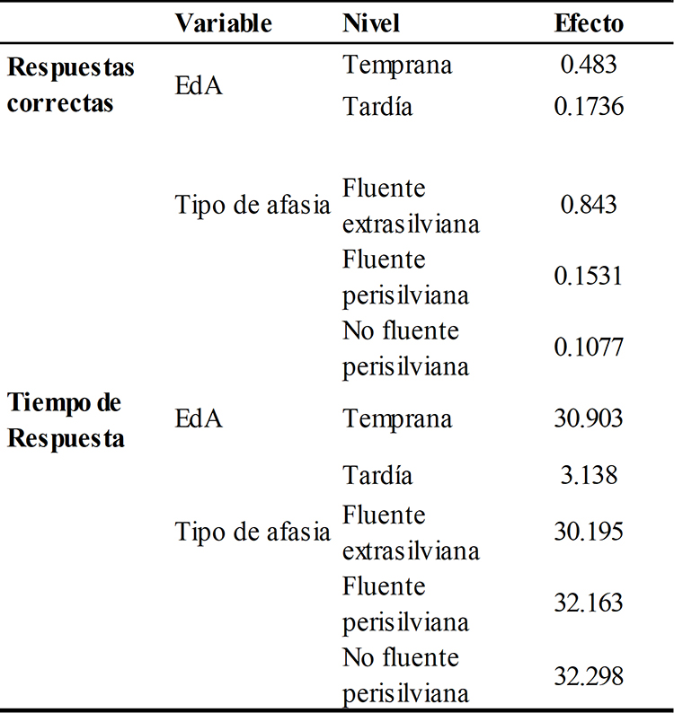 El valor negativo asociado al efecto de EdA (Tabla 3) indica que la proporción de aciertos o respuestas correctas fue significativamente menor en las respuestas ante las imágenes ATa. En cuanto a los subgrupos de sujetos analizados, los sujetos fluentes extrasilvianos obtuvieron una proporción mayor de aciertos que los sujetos fluentes perisilvianos y que los sujetos no fluentes perisilvianos, no encontrándose diferencia estadísticamente significativa entre la proporciones de aciertos de estos dos últimos subgrupos. En el caso de la covariable frecuencia léxica, el valor positivo indica que las palabras con mayor frecuencia léxica obtuvieron un mayor porcentaje de aciertos.