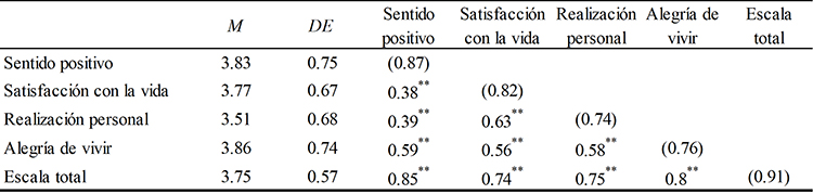 Los estadísticos descriptivos (media, desviación típica, asimetría y curtosis) obtenidos para cada una de las variables, arrojaron valores estadísticos que apuntan a la normalidad univariada de los datos. Los resultados mostraron que todas las variables tienen un valor de asimetría menor que 2, y los valores de curtosis menores que 7. La fiabilidad para la escala total fue muy alta (α = 0.91). En la tabla 3, se presentan medias, desviaciones estándar, correlaciones y coeficientes de fiabilidad por factor de la muestra 2, los cuales se aprecian aceptables (α > 0.7) (Nunnally, 1978).