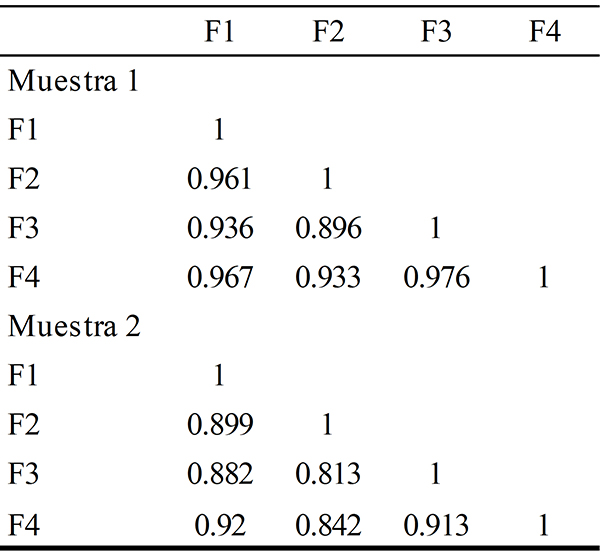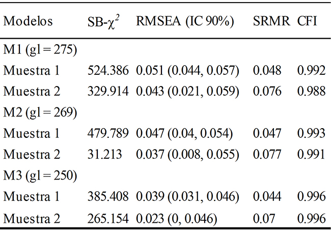 En general, se hallaron dos cosas: primero, existe una clara tendencia a encontrar valores de ajuste más satisfactorios en la muestra 2 comparados con la muestra 1, tal y como se describe en la Tabla 2, hecho que puede deberse a variaciones de las muestras, o a diferencias culturales. En segundo lugar, el ajuste de cada modelo es generalmente satisfactorio. El modelo más parsimonioso (M1, unidimensional) fue satisfactorio, similarmente al modelo oblicuo (M2), e incluso con un leve mejor ajuste en SRMR y CFI. Por otro lado, la correlación interfactorial estimada, desde este modelo (M2) se muestra en la Tabla 3, en donde se observa valores entre 0.8 y 0.97. Este grado de correlación es muy alto comparado con el límite generalmente recomendado para identificar correlaciones elevadas (> 0.5; Cohen, 1988), lo que sugiere la existencia de fuerte dependencia entre constructos orientados a medir diferentes aspectos o factores de los mismos. Aunque estadísticamente este modelo produce menor discrepancia en el ajuste, es razonable considerarlo conceptualmente redundante debido al tamaño de las correlaciones. El modelo final, correspondiente al bifactor (M3), presentó el mejor ajuste; sin embargo, se hallaron problemas de convergencia debido a que se obtuvo una matriz definida no positiva. Tomando en cuenta la evaluación del M2, en el que se hallaron correlaciones interfactoriales muy altas, se sospechó que el problema sería la dependencia lineal entre las correlaciones de algunas variables.