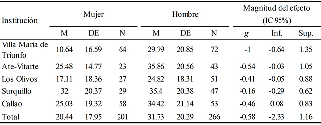 Se examinó la variabilidad del puntaje respecto al sexo e institución educativa (5 niveles de grado), mediante un ANOVA factorial 2x5. El efecto total de estas variables sobre el puntaje fue R2 = 0.154 ( = 0.137). La interacción sexo e institución apenas se acercó al nivel de significancia, F (4.547) = 2.362, p = 0.052, η2parcial= 0.02; pero los efectos principales provenientes de la institución (F [4.457] = 8.91, p < 0.001) y sexo (F [1.457] = 27.23, p < 0.001) sí tuvieron influencia más allá del error de muestreo. Esto indica que la tendencia al videojuego varía fuertemente de acuerdo a la institución específica muestreada, y de manera similar ocurre con el sexo, hallazgo también descrito en el párrafo anterior. El grado de influencia más grande proviene de la institución (η2parcial = 0.072) comparado con la influencia del sexo (η2parcial= 0.056), pero este último puede considerarse también un efecto grande. En la Tabla 6 aparecen los puntajes promedio de las instituciones según el sexo. El grado de diferencia entre varones y mujeres va desde un nivel trivial (institución de Surquillo) hasta una diferencia sustancial entre los puntajes (institución de Villa María del Triunfo).