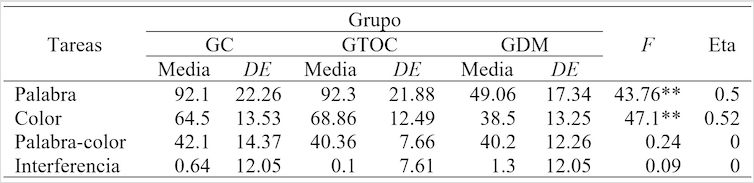 En el Test de Stroop se encontraron diferencias estadísticamente significativas en las tareas de lectura de palabras y de denominación de colores, en las que el GC y el GTOC obtuvieron puntuaciones similares; el GDM obtuvo un peor desempeño que los otros dos grupos. En la tarea de palabra-color y en la puntuación de interferencia, los tres grupos presentaron diferencias no significativas (Tabla 1).