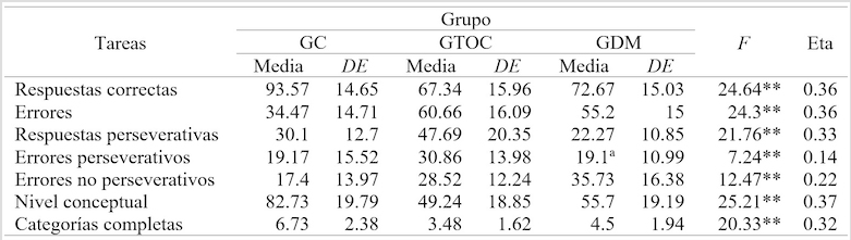En el WCST se encontraron diferencias estadísticamente significativas en todas las tareas. La tendencia de los resultados apunta a que el rendimiento del GC fue mejor que la de los otros dos grupos en la mayoría de la tareas: respuestas correctas, errores, errores no perseverativos, nivel conceptual y categorías completas, solo en errores perseverativos fue similar al GDM. El caso del GTOC fue el que tuvo peor desempeño que el GDM, por presentar menos respuestas correctas y categorías completas, más errores, errores perseverativos y respuestas perseverativas, sin embargo, el GDM cometió más errores no perseverativos (Tabla 2).