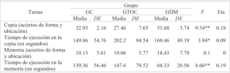 En el Test de la Figura Compleja de Rey, se encontraron diferencias estadísticamente significativas en la tarea de copia, en el tiempo de ejecución de la copia y en el de la memoria. En ellas, el GTOC fue menos preciso y el más lento en terminar las tareas que el GC y el GDM; en la copia, estos se desempeñaron de forma similar, pero el GDM tardó más que el GC en terminar la copia; lo contario sucedió en el tiempo de ejecución en la memoria ya que el GDM fue más rápido que el GC. En cuanto a la precisión en la tarea de memoria, no se encontraron diferencias significativas en el desempeño de los tres grupos (Tabla 3).