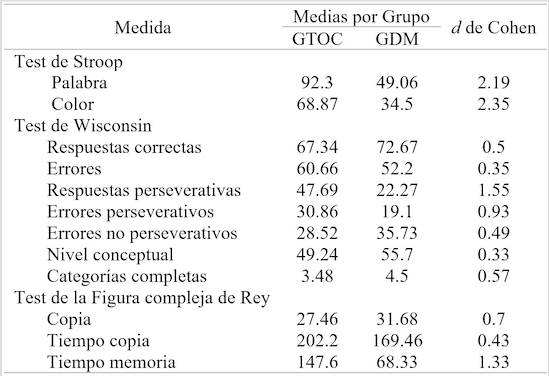 Al parecer, el GDM presentó un perfil neuropsicológico propio pero similar al del GTOC, con base en el tamaño del efecto con la d de Cohen.