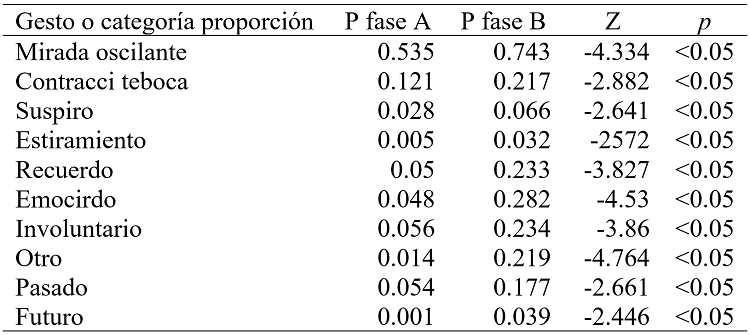 Respecto a los análisis a nivel de “individuo” las comparaciones según fase (estimulo no verbal vs. estímulo verbal) se presentan en la Tabla 1, con las proporciones promedio de emergencia los gestos y categorías verbales estadísticamente significativos separados por fase y el valor del estadístico de prueba y la probabilidad de error de tipo 1 observada.