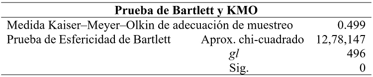 Previo al análisis de componentes principales se realizaron dos pruebas para evaluar la factibilidad del análisis. La medida de Kaiser-Meyer-Olkin [KMO] arrojó 0.499 lo que indica que se cumplen las condiciones para indicar que las variables se pueden correlacionar. Por otro lado, la prueba de esfericidad de Bartlett entregó una significancia de 0 (p < 0.005), lo que permite asumir que las variables correlacionan entre sí.