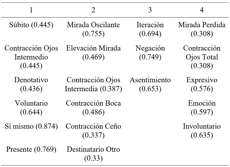 El análisis de componentes principales, integrando las categorías verbales y no verbales, evidenció la presencia de cuatro conglomerados, los cuales explican en su conjunto un 53.5 % de la variabilidad de la totalidad de las variables analizadas en este estudio. Las agrupaciones de componentes principales se describen en la siguiente tabla.