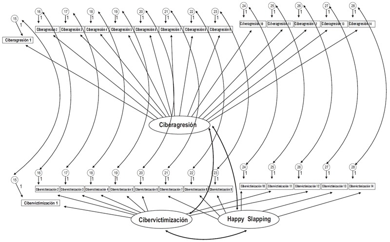 En primer lugar y teniendo en cuenta el análisis factorial exploratorio, se puso a prueba un modelo de tres factores relacionados (las dos subescalas de Cibervictimización y la de Ciberagresión), con las covarianzas entre los errores de medición de las preguntas que inquirían conductas similares, como si fueran medidas repetidas (Modelo 1), siguiendo los lineamientos de Gámez-Guadix et al. (2014). Dicho modelo se presenta en la Figura 1.