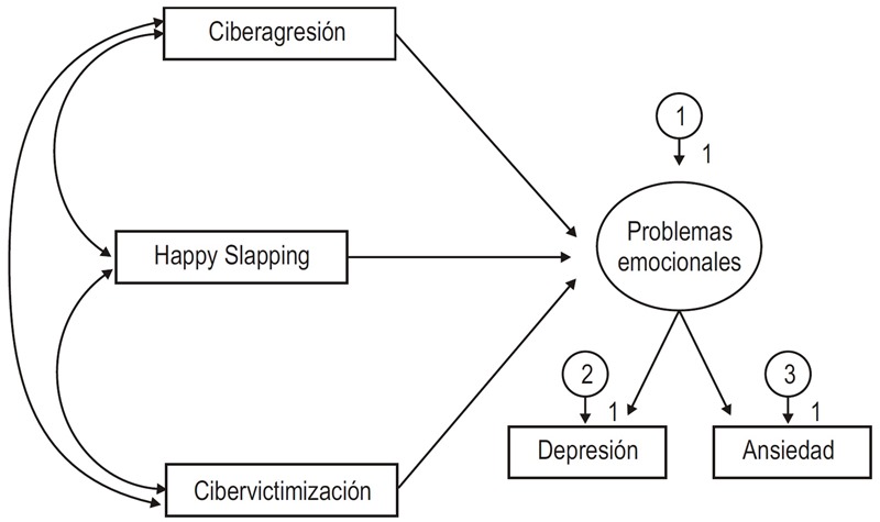 En lo referente a la validez convergente de las subescalas Cibervictimización total, Cibervictimización y Happy Slapping, estas se asociaban significativamente con la escala de Depresión de Kovacs (1992) (r = 0.420, 0.430 y 0.267, respectivamente) y la medición de Ansiedad de Rosenberg (1973) (r = 0.337, 0.376 y 0.152, respectivamente). En lo relativo a la validez de la escala de Ciberagresión, esta se correlacionaba con la escala de Depresión y Ansiedad (r = 0.256 y 0.141, respectivamente). Que las subescalas de Cibervictimización correlacione linealmente con los problemas emocionales, como depresión y ansiedad, mientras que Ciberagresión lo haga también con dichos problemas emocionales, es algo que también fue detectado en estudios extranjeros (Kowalski et al., 2014; Mehari et al., 2014), lo cual indicaría su validez convergente. También se puso a prueba un modelo de ecuaciones estructurales con las tres subescalas del Cuestionario de Ciberbullying (como variables exógenas) y los problemas emocionales (con los puntajes de depresión y ansiedad como variable latente endógena) que demostró validez convergente para las subescalas Cibervictimización y Ciberagresión, aunque no para Happy Slapping.