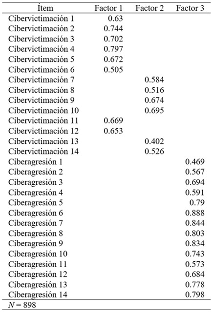 Para evaluar la estructura factorial del Cuestionario de Ciberbullying, en primer lugar, se realizó un análisis factorial exploratorio con los 14 ítems de la subescala de Cibervictimización y los 14 de la subescala de Ciberagresión. Se solicitó la extracción de autovalores mayores a 1 y una rotación Oblimin, ya que se postulaban factores correlacionados. El cálculo del índice de adecuación muestral Kaiser-Meyer-Oklin (KMO = 0.91) y la prueba de esfericidad de Bartlett (χ2 = 16748.91; p < 0.001) indicaron que era apropiado llevarlo a cabo.