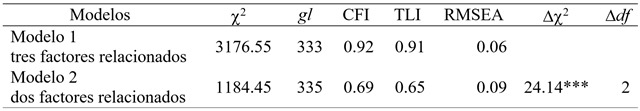 Los resultados mostraron un ajuste adecuado para el Modelo 1 CFI = 0.92, TLI = 0.91 y RMSEA = 0.06, como se ve en Tabla 2. Se consideran valores de CF1 y TLI por encima de 0.9 y RMSEA por debajo de 0.1 como adecuados (Bentler, 1992; Byrne, 2010). También los valores estaban sumamente cercanos a criterios más exigentes con más de 0.95 y menos de 0.05, respectivamente (Hu & Bentler, 1999).
