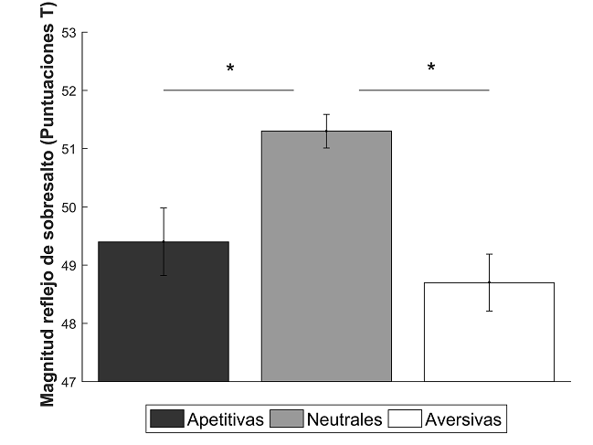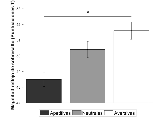 Los resultados con la metodología de inhibición prepulso también muestran una mayor respuesta atencional ante las imágenes con contenido afectivo (apetitivas y aversivas) en comparación con las imágenes neutrales, lo que se observa en la inhibición del reflejo de sobresalto ante las imágenes afectivas. Estos mismos resultados han sido encontrados previamente (Bradley et al., 2006), y sugieren que los estímulos afectivos capturan mayores recursos atencionales de forma inmediata y dejan pocos recursos para otros estímulos (sonido de sobresalto); por el contrario, las imágenes neutrales, al ser poco relevantes, capturan pocos recursos atencionales y dejan muchos recursos libres, los cuales son invertidos en el sonido, generando, de esta forma, una mayor amplitud del reflejo de sobresalto. Otros estudios han obtenido resultados contradictorios; Gard, Gard, Mehta, Kring y Patrick (2007) encontraron una potenciación del reflejo de sobresalto ante imágenes aversivas aun ante una corta latencia entre la imagen y el sonido, estos resultados sugieren que cuando el estímulo aversivo es altamente relevante para el individuo (relevancia conductual), logra activar el sistema motivacional defensivo en pocos milisegundos, por ejemplo, con personas fóbicas (Globisch, Hamm, Esteves, & Öhman, 1999).