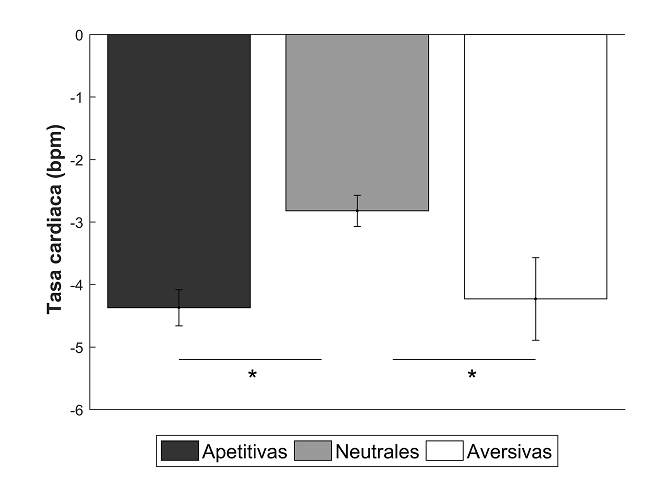 La mayor desaceleración de la tasa cardiaca como indicador fisiológico de una respuesta de atención hacia estímulos afectivos es coherente con los resultados en la RCP y ha sido observada previamente en diferentes estudios (Bradley, 2009; Bradley et al., 2001). La activación progresiva del sistema motivacional apetitivo o defensivo implica el cambio de una fase inicial de atención a una fase final de acción (Bradley & Lang, 2007), de esta forma, los estímulos altamente apetitivos o aversivos se asocian a una mayor desaceleración de la tasa cardiaca. La respuesta de bradicardia o desaceleración de la tasa cardiaca ante estímulos novedosos se ha observado en toda clase de animales, desde reptiles hasta mamíferos, y está controlada por la inervación parasimpática vagal, a través de receptores colinérgicos del corazón (Lang, Simons, & Balaban, 2013). La función evolutiva de la respuesta de bradicardia es facilitar el procesamiento central de la información sensorial presente en el contexto a través de la redistribución del fluido sanguíneo (Graham & Clifton, 1966).