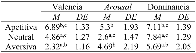 El ANOVA para la dimensión de valencia encontró un efecto principal significativo para Imagen (F2,72 = 175.65, p < 0.0001, ηp2 = 0.83). Como era de esperarse, las imágenes apetitivas tuvieron mayores puntajes en valencia y las aversivas, menores; se encontraron diferencias entre todas las categorías de imágenes (todas las p < 0.001). Se encontró una tendencia lineal fuerte y significativa entre las imágenes (F1,36 = 271.04, p < 0.0001, ηp2 = 0.88). El ANOVA para la dimensión de arousal también identificó un efecto principal significativo para Imagen (F2,72 = 33.13, p < 0.001, ηp2 = 0.47). Las imágenes apetitivas y aversivas tuvieron mayores puntajes en arousal que las imágenes neutrales (ambas p < 0.001). La tendencia cuadrática entre las imágenes fue significativa y con un tamaño del efecto grande (F1,36 = 65.09, p < 0.0001, ηp2 = 0.64). Finalmente, el ANOVA para la dimensión de dominancia encontró nuevamente un efecto principal significativo para Imagen (F2,72 = 27.32, p < 0.0001, ηp2 = 0.43). Las imágenes neutrales tuvieron los mayores puntajes en dominancia, seguidas por las imágenes apetitivas y las aversivas (todas las p < 0.005). Una fuerte y significativa tendencia cuadrática se encontró entre las imágenes (F1,36 = 34.69, p < 0.0001, ηp2 = 0.49) (Tabla 1).