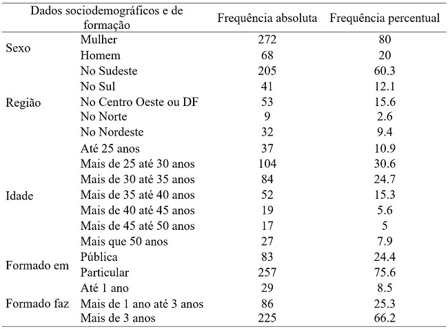 Desses participantes, a maioria é formada por mulheres (80%), com uma idade modal entre 25 e 30 anos (30.6%) e que se concentraram com maior frequência na região Sudeste (60.3%), que é a região do Brasil que reúne os CRP-04 (Minas Gerais), CRP-05 (Rio de Janeiro), CRP-06 (São Paulo) e CRP-16 (Espírito Santo). 75.6% dos participantes se formaram em faculdades particulares e estão na área há mais de 3 anos (66.2%). Dito de outra forma, a pesquisa foi respondida por profissionais jovens do Sudeste, o que é relacionado com o perfil populacional da profissão no Brasil (Monte, 2015).