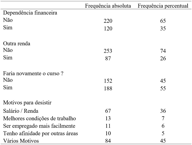 Ainda, para o item “Já pensou em desistir”, os resultados originais apontaram que 172 participantes marcaram que “não” e que 168 marcaram que “sim”. Porém, em relação à pergunta “Pensou em desistir por quais motivos”, 185 pessoas (54%) marcaram algum dos itens. A Tabela 2 também apresenta estes resultados.