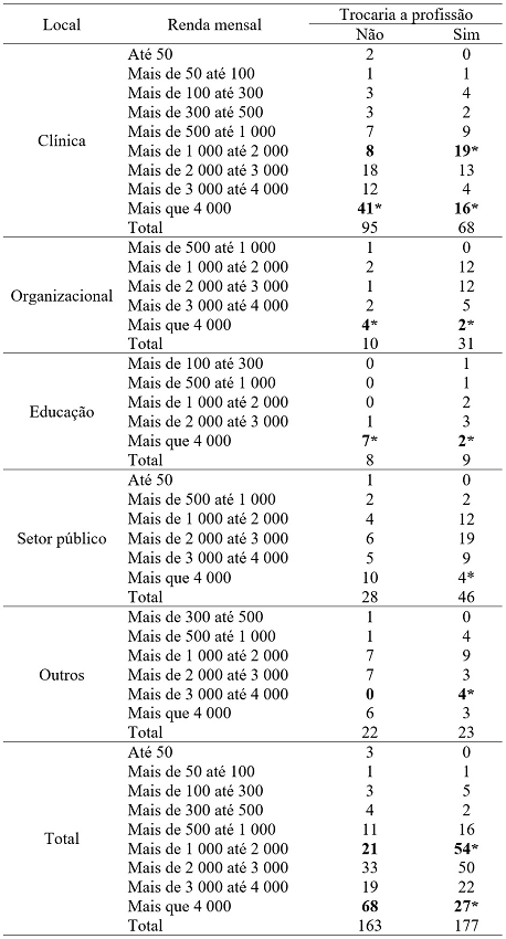Em resposta à pergunta que avaliava se o participante deixaria de trabalhar como psicólogo se possuísse uma renda maior em outra área, 52% responderam que sim. Excetuando os locais de trabalho, o psicólogo que gera até R$ 2 000 por mês trocaria de profissão caso outra pagasse mais (χ² (8, N = 340) = 40 501, p < 0.05). Porém, ressalva-se que o local de trabalho altera essa resposta: os psicólogos da clínica que ganham mais de R$ 1 000 até R$ 2 000 trocariam sua área por outra que pagasse melhor fora da Psicologia, mas essa decisão muda nas faixas subsequentes e torna-se estatisticamente diferente aos que ganham mais de R$ 4 000, que não trocariam Psicologia (χ² (8, N = 163) = 18 892, p < 0.05).