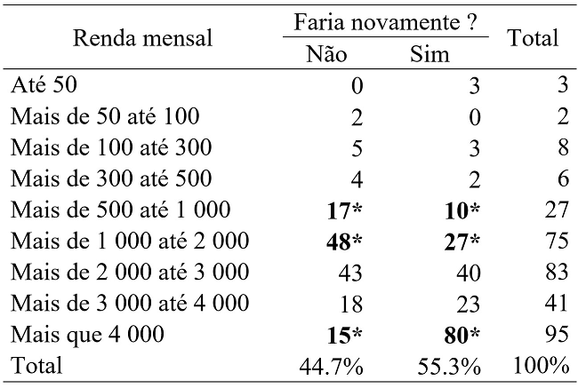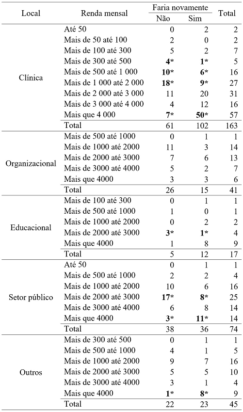 Utilizando-se mais cruzamentos (Tabela 5) acerca da intenção de fazer novamente o curso dado a renda gerada por todos os tipos de locais possíveis na pesquisa (5x9x2) constatou-se que os psicólogos clínicos que produzem até R$ 2 000/mês não fariam novamente o curso, mas os que os que tem renda maior que R$ 2 000 em diante voltariam a cursas a graduação. A diferença estatisticamente significativa foi gerada justo pela discrepância entre o valor esperado e o valor observado nestas classes (χ² (8, N = 163) = 42 514, p < 0.05).