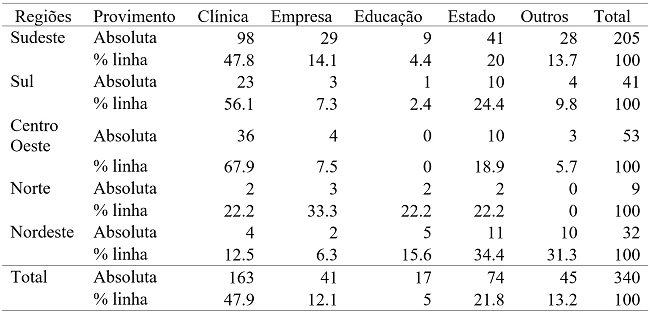Por fim, analisou-se o local de trabalho a partir das regiões brasileiras e os resultados mostram que 47.9% dos psicólogos que participaram do estudo geram sua renda principal da atividade clínica, seguido pelos funcionários públicos (21.8%) e constatou-se que não houve diferença estatisticamente significativa para a renda em função do sexo (χ² (8, N = 340) = 11 061, p = 0.198). A última análise mostrou que o Centro-oeste concentra os psicólogos em sua maioria no exercício da clínica (67.9%) e o Nordeste apresenta o maior contingente de funcionários públicos (34.4%), o que está expresso na Tabela 6.