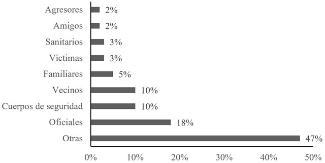Además de analizar los responsables directos de la elaboración de las publicaciones, se buscó identificar las fuentes que emplearon los diarios para respaldar la información presentada. Ante la limitación de conocer de manera exhaustiva la totalidad de las fuentes de las que se sirve cada diario en el desarrollo de sus textos, se recogieron y cuantificaron aquellas que fueron citadas de forma explícita. La mayoría de las publicaciones no citó ninguna fuente o aparece únicamente una (85.5 %), en menor medida se emplean dos (11.6 %) o entre tres y más (3 %). Se observa, por tanto, una carencia en el uso de fuentes citadas que puede llegar a comprometer la credibilidad y contextualización de la información presentada. Las fuentes que se emplean con mayor frecuencia para respaldar las noticias son de carácter oficial (18 %). Su uso puede estar justificado en que se trata de fuentes legitimadas y de necesaria consulta para la elaboración de la información, pero la voz concreta queda difuminada bajo el término genérico oficial. Lo mismo ocurre con los cuerpos de seguridad, segunda fuente con mayor presencia en las publicaciones analizadas (10 %). Otras fuentes de información reportadas de corte personificado son: los vecinos (10 %), la red de apoyo de la víctima bien sea familiares (5 %) o amigos (2 %), el personal sanitario (3 %) o las propias víctimas (3 %) y, en menor medida, los agresores (2 %) (Figura 2).
