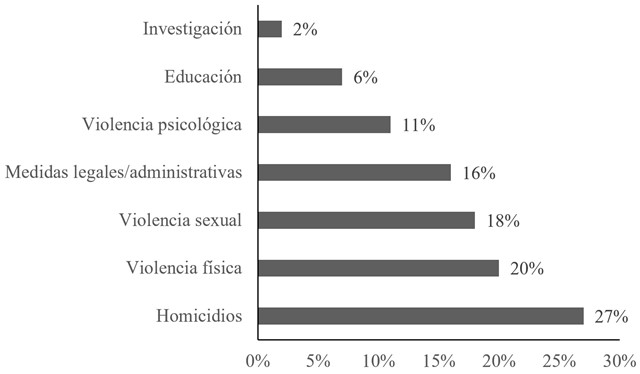 En su contenido, las publicaciones dieron cubrimiento, principalmente, a hechos relacionados con violencia homicida (27 %), hacia mujeres a manos de sus parejas o exparejas por razón de género; física (20 %), sexual (18 %) y psicológica (11 %). Se identificó un muy bajo cubrimiento a la violencia económica o patrimonial, de control e incluso estructural (Figura 3). Las consecuencias para el agresor contenidas en medidas legales y/o administrativas (16 %) también tuvieron relevancia dentro del cubrimiento generado por parte de los diarios. En menor medida, se realizaron publicaciones centradas en medidas de prevención en relación con educación (6 %) o investigación (2%).