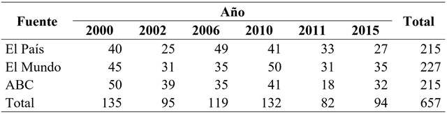 Las variables a partir de las que se analizaron las publicaciones fueron: (1) el año de la publicación, (2) la fuente (periódicos El País, El Mundo y ABC), (3) el abordaje como temática principal o no, (4) la autoría de las publicaciones, (5) las fuentes de información explícitamente citadas, (6) la temática abordada y (7) los términos empleados para referirse a la violencia de género.
