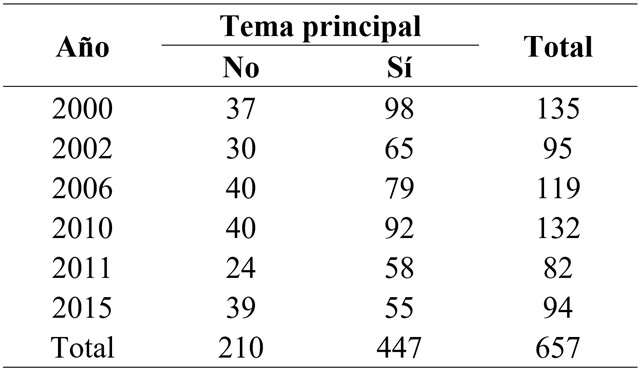 Al revisar la relación entre el hecho de ser tema principal o no, con las diferentes anualidades estudiadas, como se observa en la Tabla 2, se encontró que no existen diferencias estadísticamente significativas y que tampoco es posible apuntar que la aplicación de macroencuestas a nivel nacional suponga un aumento cuantitativo de publicaciones sobre violencia de género. De hecho, el año 2010, año de control y, por tanto, sin sondeo nacional, aparece como el segundo en producción de este tipo de contenidos.