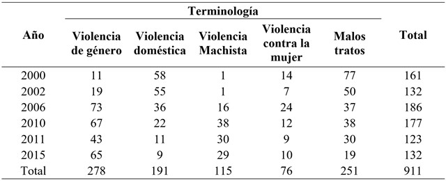 Por último, se llevó a cabo un análisis sobre los términos utilizados para hacer referencia al fenómeno de la violencia de género, tal como se observa en la Tabla 3. El uso de los términos violencia de género y violencia machista con el paso de los años ha tenido un elevado aumento, en contraste con el notable descenso en el uso de los términos violencia doméstica y malos tratos (aunque presentes en cada uno de los periodos de estudio). Esto se puede deber al avance en términos legislativos y de generación de conocimiento que se ha experimentado a nivel global, regional y nacional, en los últimos años. Reemplazar terminología de corte difuso y genérico como malos tratos por terminología específica como violencia de género o violencia machista permite visibilizar y caracterizar este fenómeno de relevancia social.