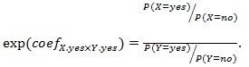 The homogeneous model assumes that the interaction between two variables is independent of the value taken by the third. To interpret this type of model, it is important to remember that the exp(coef) of the interactions represents an odds ratio. If we recall that the adjustment takes the value no as a reference category, we are speaking of