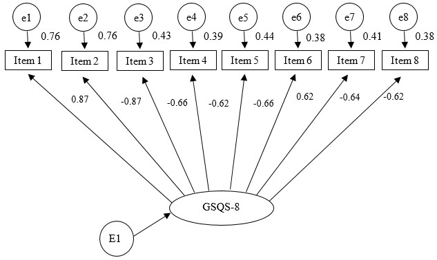 Table 2 shows the mean, the standard deviation, the reliability coefficients, and the confidence intervals of the GSQS-8. The reliability of the scale is 0.90 with a 95 % confidence interval of 88 to 0.92. Therefore, the values were higher than the recommended value of 0.70 (Nunnally & Bernstein, 1994).