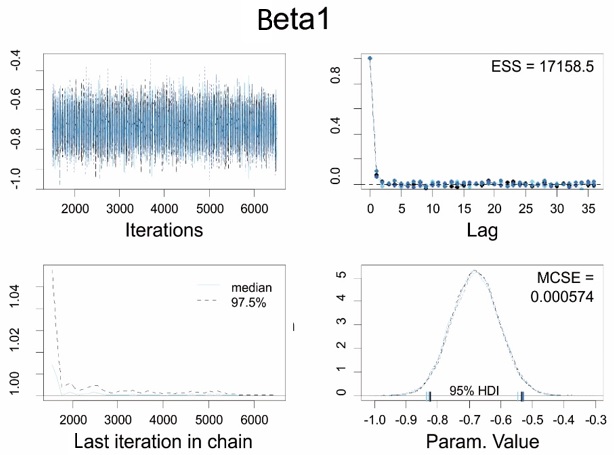 The results of the MCMC simulation presented in the diagram consisted of the highest density interval (HDI). HDI determines where are the densest range in the posterior probability distribution (Kruschke, 2015). Ninety-five percent of HDI used to conclude the presented result. Kruschke & Liddell (2018) said the use of 95% HDI simply because of its familiarity with a 95% confidence interval in the frequentist method.