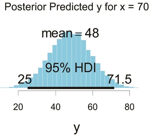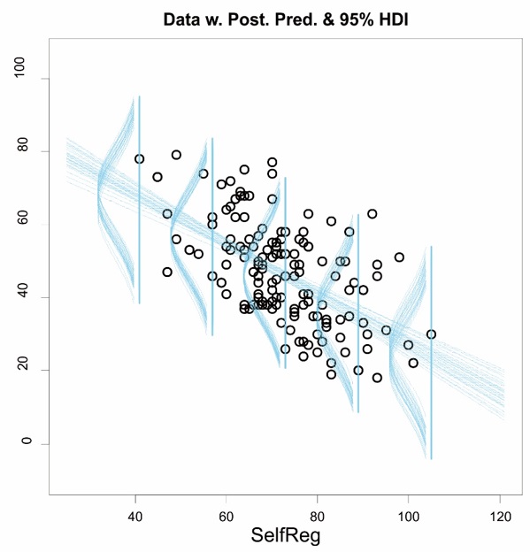 According to Kruschke (2015), we can assess whether the null value is rejected or otherwise by observe 95 % HDI. If it falls entirely outside the ROPE, then the null hypothesis is rejected. Figure 1 illustrates posterior distribution due to the MCMC simulation chain and ROPE range value and HDI. The middle panel on Figure 2 portrays that the null value rejected as the result of 95 % of HDI fall completely outside ROPE (-0.5 - 0). To put it briefly, the result describes that self-regulation influences smoking addiction (see scatterplots in Figure 3). In Figure 4, the superimposed line illustrates the posterior predictive regression line, while the vertical line shows smoking addiction probability when self-regulation equals "x." For instance, if the self-regulation score is 70, then 95 % predicted posterior distribution of smoking addiction falls within the 25 - 71.5 range (see Figure 4).