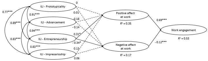 In order to more deeply explore the relationships among ILI dimensions and employees’ job-related affect and work engagement, we tested the model proposed in Figure 1. The fit indices for this model were adequate (CFI = 0.93, NNFI = 0.92, and RMSEA = 0.07), except for chi-square (S-Bχ² (389) = 2026.10, p < 0.001). Regarding the relationship among variables, only identity entrepreneurship was directly and significantly related to positive and negative affect, both of which were significantly related to employees’ work engagement in the hypothesized directions. In particular, employees reported greater positive affect and lowered negative affect due to their increased perception of leaders’ identity entrepreneurship. Regarding the significance and relevance of the relationships in the model, positive affect had a stronger direct link to work engagement than negative affect (β = 0.69, p < 0.001 and β = -0.12, p < 0.001, respectively). Moreover, the percentages of variance explained were 52.9% for work engagement, 35% for positive affect, and 17.1% for negative affect; the fact that they were all greater than the recommended cut-off value of 10% (Falk & Miller, 1992) substantiated the model’s predictive validity.