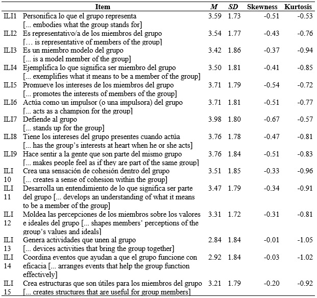 First, all 15 items showed acceptable asymmetry and kurtosis across the sample (Table 1). Mean values ranged from M = 2.84 (ILI 13... [My immediate supervisor…] devices activities that bring the group together) to M = 3.68 (ILI 7... [My immediate supervisor] stands up for the group).