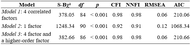 Table 3 shows that all factor loadings were 0.70 or higher (Hair et al., 2006). Convergent validity, measured by the average variance extracted (AVE), represents the common variance between indicators and their construct (Fornell & Larcker, 1981). The AVE values obtained, all over 0.50, revealed adequate convergent validity (Table 3). To assess internal consistency, we calculated Cronbach’s alphas and composite reliability for each of the four factors and the 15-item scale as a whole. All coefficients exceeded the cut-off value of 0.70 (Table 3). These results provide additional support to H1.