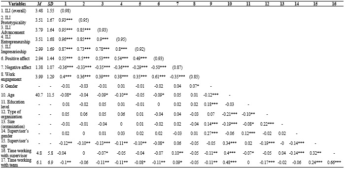 The correlations we obtained among ILI dimensions and employee variables (positive and negative affect at work, as well as work engagement) provide initial support for the validity of the ILI (Table 4). In line with H2, ILI facets were positively related to work engagement and positive affect at work. At the same time, all these variables were negatively related to negative affect, with correlations ranging in absolute size between 0.29 and 0.61. Participants’ key demographic variables were largely unrelated to the study’s variables. However, participant age, supervisor age, and time working with the same team presented some significant low negative correlations with the global ILI measure, several ILI facets and positive affect. Time working with the supervisor and time working with the team was slightly related to negative affect. None of the demographic variables was associated with work engagement.