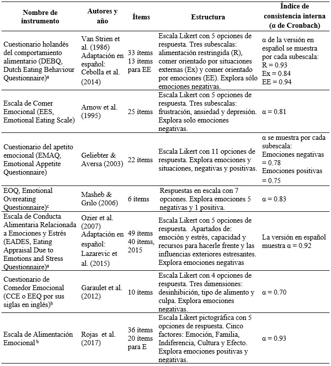 En la literatura científica existen varios instrumentos que abordan aspectos de la influencia de las emociones en la ingesta; pero se centran en el comer emocional y en los riesgos de trastornos de la alimentación, incluso en algunos la cantidad de ítems destinados a estos constructos es limitada. Los instrumentos de medición sobre la influencia de las emociones en la conducta alimentaria, específicamente en la motivación por comer, se muestran en la Tabla 1. Todos son para adultos; algunos han sido adaptados para población hispanoparlante.