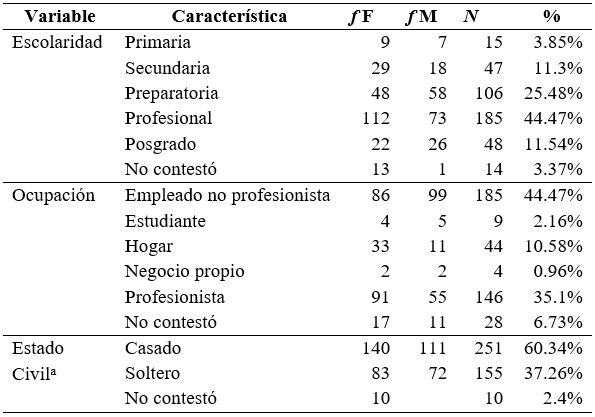 El muestreo fue no probabilístico por conveniencia en la zona metropolitana de Monterrey, Nuevo León, México. La muestra se constituyó por 416 adultos, 233 mujeres (56.01%) y 183 hombres (43.99%); cuyas edades de los participantes fluctuaron entre los 18 y 78 años, con Media = 39.43 y DE = 12.56. En la tabla 2 se muestran las características sociodemográficas de los participantes.