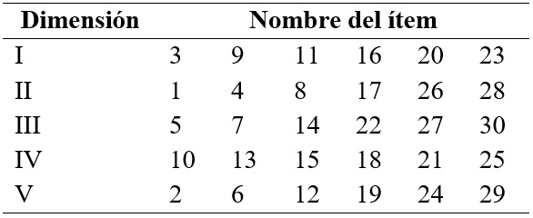 Así mismo, se hizo una nueva agrupación de los ítems de manera aleatoria pero separando cada dimensión a fin que no quedaran dos ítems de la misma dimensión consecutivos. El orden de acuerdo a la dimensión se muestra en la tabla 3.