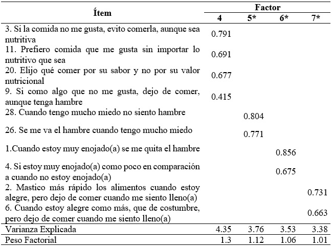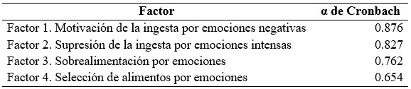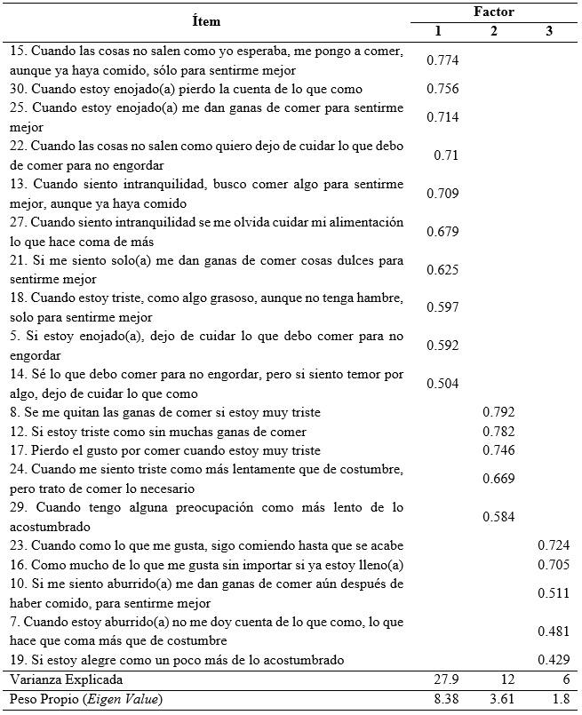 El factor 1, Motivación de la ingesta por emociones negativas, muestra que los ítems del comer motivado por emociones negativas tienen una gran comunalidad con los ítems que indagan la influencia de las emociones en un estilo restrictivo de alimentación. Una posible explicación es la alta susceptibilidad que presentan los dietantes crónicos ante las emociones negativas (Silva, 2007) y la asociación entre la ingesta restringida y la ingesta emocional que indican Verzijl et al. (2018).