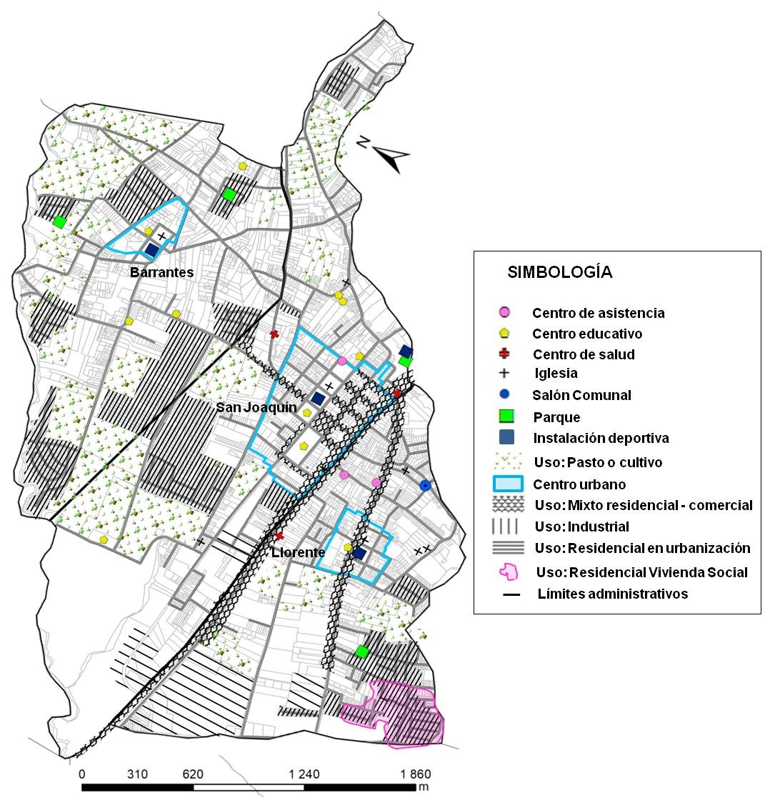 Una vez confirmado el ajuste del modelo, y por tanto la aportación a la validez de la escala de MTSOCS, se revisaron las distribuciones geográficas de los datos sobre el mapa del cantón, permitiendo identificar zonas donde hay mayor concentración de valores de respuesta para cada uno de los ítems y factores de la escala utilizada. El mapa de la Figura 1 muestra la distribución de los distintos usos de suelo y los diversos ámbitos residenciales según tipología en cada uno de los tres distritos. Adicionalmente, se resalta la ubicación de los núcleos urbanos centrales de los tres distritos y la locación de los principales equipamientos.