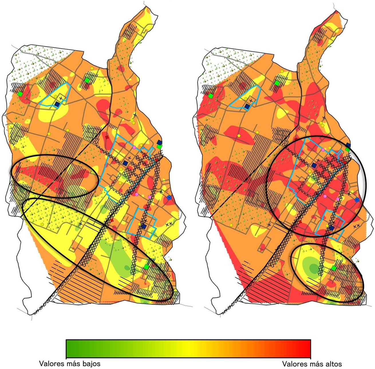 Para la segunda parte del estudio se utilizó el programa ARCGIS (ArcMap) 10.6.1, y se utilizó la herramienta de interpolación por vecino natural para la generación de mapas con color de los datos recopilados con el cuestionario. Para la elaboración de los mapas se utilizó una escala con cinco clases, cuyos rangos de corte se establecieron con el criterio de intervalos iguales, generados a partir de los valores mínimos y máximos presentes en los datos. Los colores variaron de verde oscuro (valores mínimos) a rojo (valores máximos) y se superpuso sobre la cartografía del cantón.