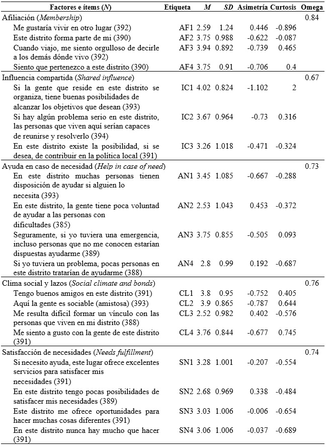 Para estos autores, la subescala Ayuda en caso de necesidad, busca evaluar las conexiones emocionales compartidas a partir de la disponibilidad de soporte en la comunidad, mientras que la subescala Clima social y lazos explora las conexiones emocionales compartidas, pero a partir de las relaciones sociales, contactos e interacciones que posibilitan los vínculos. Los ítems incluidos para la subescala Ayuda en caso de necesidad fueron: “En este distrito muchas personas tienen disposición de ayudar si alguien lo necesita”, “En este distrito, la gente tiene poca voluntad de ayudar a las personas con dificultades”, “Seguramente, si yo tuviera una emergencia, incluso personas que no me conocen estarían dispuestas a ayudarme” y “Si yo tuviera un problema, pocas personas en este distrito tratarían de ayudarme”; mientras que para Clima social y lazos fueron: “Tengo buenos amigos en este distrito”, “Aquí la gente es sociable”, “Me resulta difícil formar un vínculo con las personas que viven en mi distrito” y “Me siento a gusto con la gente de este distrito”.
