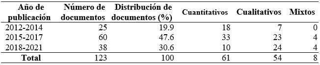 La Figura 1 señala el número de publicaciones empíricas por año, durante la década de 2012 a 2021. La distribución de los documentos encontrados de acuerdo con el método de investigación empleado fue, para estudios cualitativos de 43.9 % (n = 54), cuantitativos de 49.5 % (n = 61) y mixtos 6.5 % (n = 8).