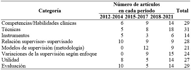 Se observa mayor frecuencia en las categorías de técnicas de supervisión (n = 31), las habilidades clínicas y de supervisión (n = 29), la evaluación de la supervisión (n = 29), la relación supervisor-supervisado (n = 28) y la utilidad de la supervisión (n = 27).