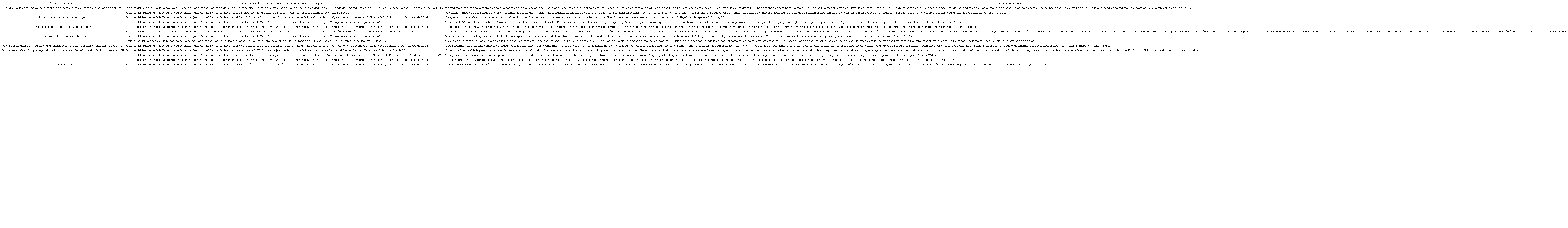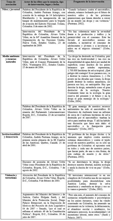Finalmente, la forma en que los componentes arriba presentados se expresan, es a partir de los discursos e intervenciones de las élites de las políticas públicas que los representan, quienes, por su nivel de credibilidad, poder y liderazgo, los refuerzan en diferentes escenarios internacionales como nacionales, buscando aglutinar actores a su alrededor, recibir respaldo financiero y político, al igual que mantener la convicción de la ciudadanía sobre este tipo de políticas. Para analizar esas formas de expresión, se seleccionaron fragmentos de discursos de los expresidentes Andrés Pastrana Arango (1998-2002) y Álvaro Uribe Vélez (2002-2006 y 2006-2010), así como del Ministro del Interior y de Justicia, Carlos Holguín Sardi (22 de agosto de 2006 - 20 de junio de 2008), y del Ministro de la Protección Social, Diego Palacio Betancourt (10 de febrero de 2003 - 7 de agosto de 2010). Para una mayor comprensión de la forma en que se expresa este sistema de pensamiento, se identificaron los temas con los que recurrentemente se asoció la problemática a fin de fortalecer el mismo, en tanto la opinión pública estaría más proclive a respaldar las políticas que propendieran por el prohibicionismo. Estos temas fueron la protección de la niñez y la juventud, el medio ambiente y los recursos naturales, la institucionalidad y la democracia, y la violencia y el terrorismo. Ese análisis se resume en la Tabla 4.