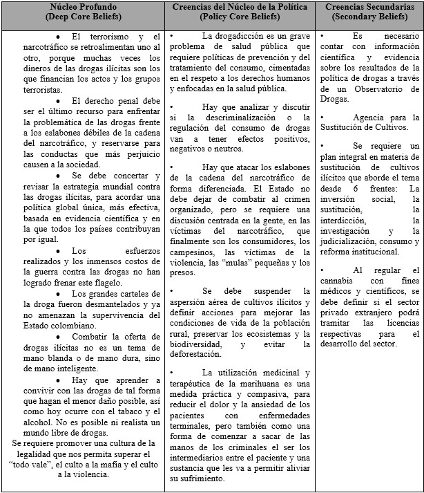 Con base en los lineamientos del MCP, en el subsistema de la política de drogas en Colombia se pueden identificar dos claros sistemas de creencias: el prohibicionista y el regulador. Si bien se puede hablar, de manera conceptual, de un tercer sistema de creencias -el legalizador-, no es posible aún identificar una coalición promotora que lo promueva.