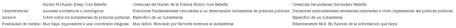 La Tabla 1 presenta una síntesis de estos tres niveles jerárquicos, comparando sus características principales, su alcance y su flexibilidad o posibilidad de cambio. La capacidad del investigador en identificar y diferenciar los tres niveles jerárquicos, le evitarán caer en equívocos al analizar los intercambios y negociaciones de los actores de las coaliciones promotoras, asignando erróneamente relevancia a aquello que no la tiene, y descuidando asuntos que pueden ser determinantes para el cambio en el subsistema de la política.
