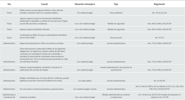 Las causales de este tipo de expulsión son las siguientes: seguir permaneciendo en Chile con permisos vencidos29; por infracciones graves o reiteradas al deber de las siguientes obligaciones: a) registrarse, obtener cédula de identidad, comunicar a la autoridad el cambio de su domicilio o actividad, b) desarrollo de actividades remuneradas sin autorización, c) continuar permaneciendo en Chile con permisos vencidos30; obtener visación mediante simulación o fraude en la celebración del contrato de trabajo31; en el caso de asilados políticos, realizar actividades que, en forma directa o indirecta, puedan significar una acción contraria al Gobierno de su país32; por revocación o rechazo de permisos y autorizaciones33.