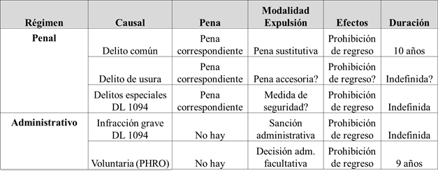 Esta situación se produce porque en nuestro sistema jurídico coexisten dos regímenes de expulsión de extranjeros: el penal y el administrativo, pero, como veremos, con una marcada tendencia hacia su convergencia. Si bien, es relevante distinguir ambos sistemas, que es lo que se hará a continuación, se deben presentar, al mismo tiempo, de manera sistemática como parte de una misma práctica jurídica, ya que ello permitirá apreciar la naturaleza jurídica del PHRO. En la siguiente tabla se resumen a grandes rasgos estos mecanismos: